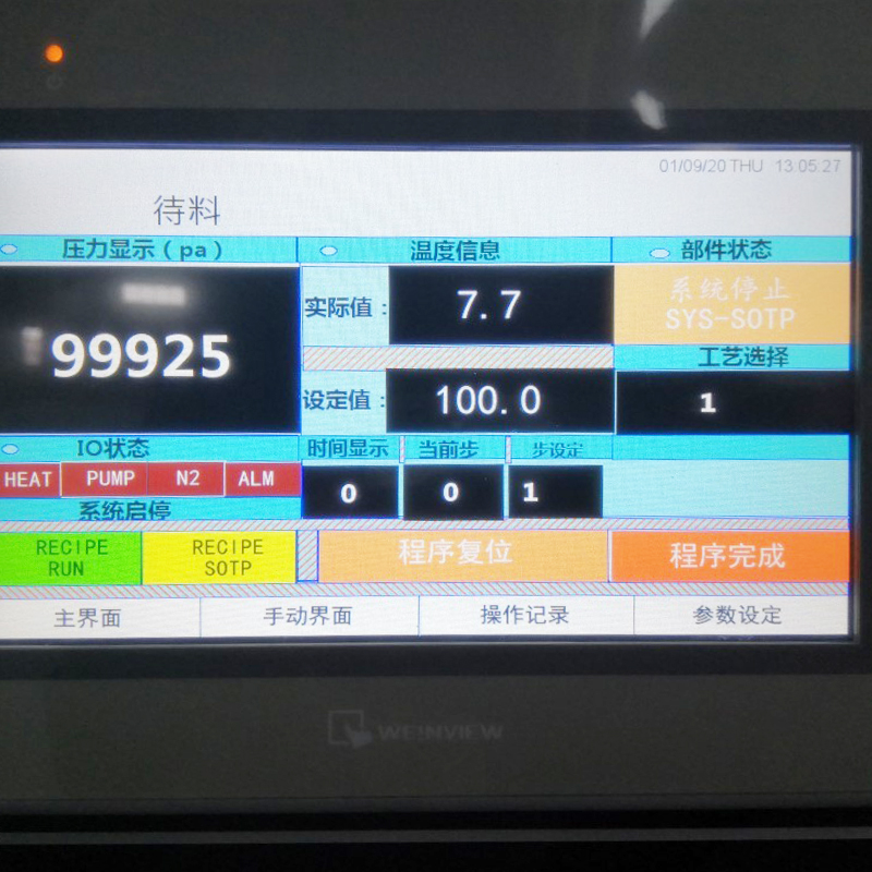| Udstyr Drift Procesbeskrivelse | Udstyret anvender PLC industriel kontrolprogrammering. Programmerbar kontrol omfatter vakuumpumpens start/stop-status, vakuumniveauindstilling, vakuumholdetid, påfyldningstid for inert gas, lukketid for inertgasmagnetventil og start/afslutning af opvarmningscyklus. | ||
