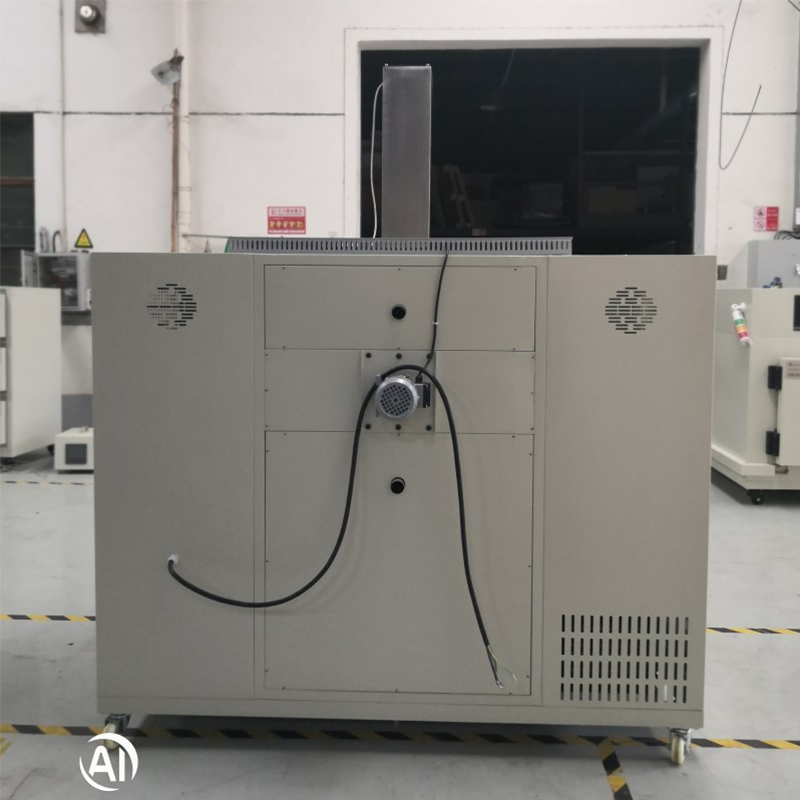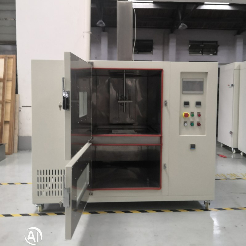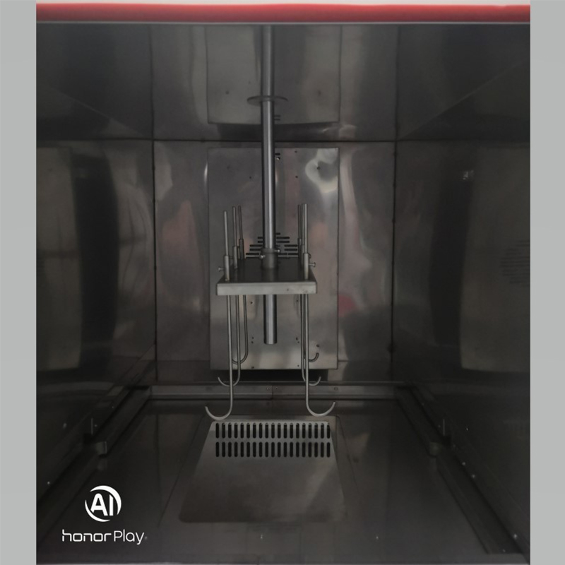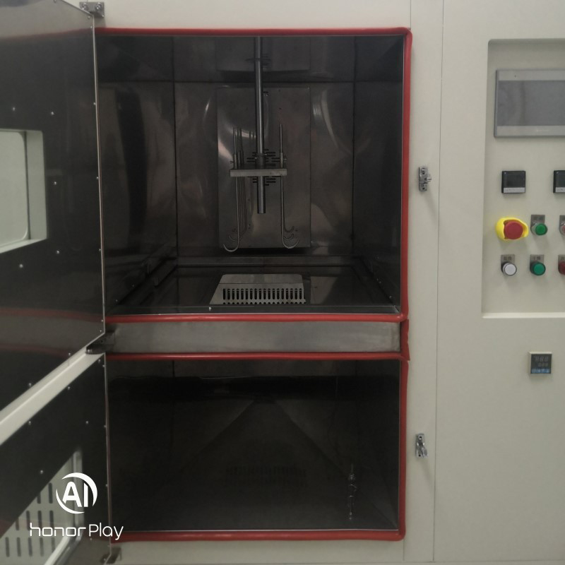 2.6. I overensstemmelse med testkravene gennemgår prøverne periodisk tørring i tørreovnen og nedsænkning i saltnedsænkningskammeret. Forud for hver cyklus indstilles tørreovnens og saltnedsænkningskammerets driftstemperaturer individuelt, og deres respektive temperaturkontrolsystemer aktiveres. Når kamrene når de nødvendige arbejdstemperaturer, konfigureres tørretiden (f.eks. 50 minutter) og nedsænkningsvarigheden (f.eks. 20 minutter), efterfulgt af indgangen og aktiverer deres respektive temperaturkontrolsystemer. Når kamrene når de nødvendige driftstemperaturer, indstilles tørretiden (f.eks. 50 minutter) og nedsænkningsvarigheden (f.eks. 20 minutter) sammen med antallet af cyklusser. Tryk på startknappen (under normale forhold er prøvestativet placeret i tørrekammeret). Testprøverne vil derefter gennemgå periodiske tørre- og nedsænkningscyklusser i henhold til den programmerede tidsplan. Efter afslutning af tørreperioden (f.eks. 50 minutter), åbnes skillevægsdøren mellem tørre- og nedsænkningskamrene. Den elektriske skubbestang placeret på toppen af kammeret sænker derefter testprøven ned i nedsænkningskammeret. Samtidig forsegler dækslet øverst på skubbestangen prøvepassagen og isolerer det øvre og nedre kammer. Når nedsænkningsperioden (f.eks. 20 minutter) slutter, løfter den elektriske skubbestang prøven tilbage i tørrekammeret. Den mellemliggende skillevæg lukker derefter automatisk og isolerer de to kamre igen. Denne sekvens udgør en cyklus, som gentages i henhold til det forudindstillede antal cyklusser, indtil testen afsluttes. Desuden må den tid, det tager for hver prøve at være helt nedsænket eller hentet, ikke overstige 2 minutter. For at imødekomme særlige krav er dette apparat desuden udstyret med separate åbne- og lukkeknapper til den mellemliggende skillevæg. Prøveholderen har også en kortvarig løfteknap, der gør det muligt at hæve eller sænke prøven efter behov for operationelle behov.