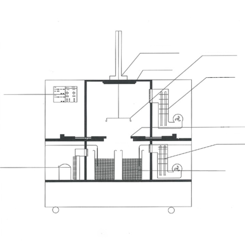 2.3 Tørrekammerets indvendige foring er fremstillet af 316L rustfrit stål. Den ydre beklædning anvender kulstofstålplade med en spraybelagt finish. Døren åbner til venstre, forsynet med høj-/lavtemperaturbestandige tætningslister. Et stort udsigtsvindue af hærdet glas letter observation. Varmesystemet indeholder interne varmerør i rustfrit stål. Luftkanalens design har luftudblæsning på højre side, med luft tilbage via venstre side. En importeret højtemperaturbestandig blæsermotor sikrer tvungen konvektion med vertikal diffusionscirkulation, eliminerer døde zoner og opnår ensartet temperaturfordeling i hele kammeret. Et klasse A højpræcis PT100 platin modstandstermometer giver følsom temperaturføling for overlegen kontrolnøjagtighed. Fugtighedsovervågning i realtid er integreret (da varmlufttørring eliminerer behovet for separat affugtningsudstyr, forbliver kammerets fugtighed ≤50%).